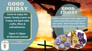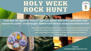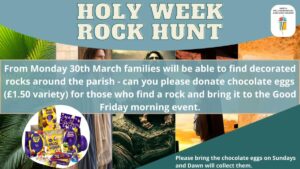 Plans for Easter are shaping up nicely. Please see below under the heading ‘Easter’ for the details as they come in. But for now, please can you donate chocolate Easter Eggs for the Good Friday morning event – just bring them along on Sunday mornings. And might you be available to help on Good Friday morning? Please speak to me asap.
